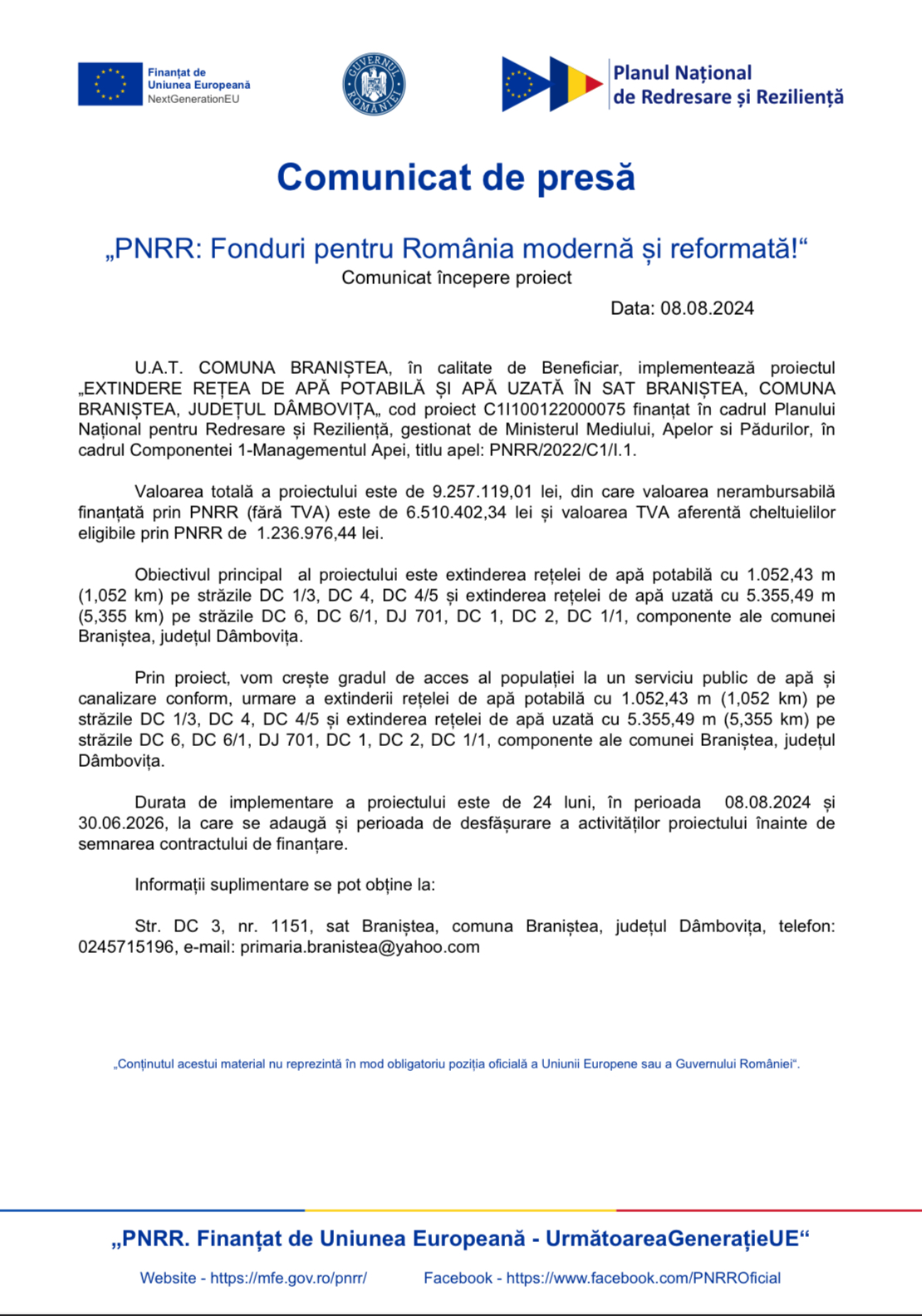 "„EXTINDERE REȚEA DE APÃ POTABILÃ ȘI APÃ UZATÃ ÎN SAT BRANIȘTEA, COMUNA BRANIȘTEA, JUDEȚUL DÂMBOVIȚA"
